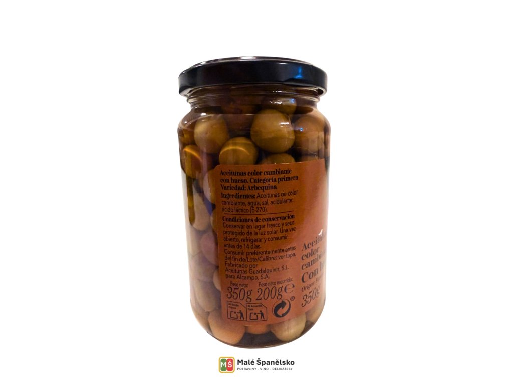 Celé španělské olivy s peckou z odrůdy Arbequina, označené jako „color cambiante“. Tento pojem se používá pro olivy sbírané ve fázi, kdy mění barvu – typicky z přirozeně zelené do tmavší, „přechodové“ zralosti. Výsledkem bývá vyvážená chuť, která se skvěle hodí do tapas i ke každodennímu zobání.