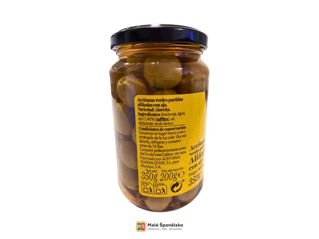| Název: | Zelené olivy „partidas“ (naříznuté) – ochucené s česnekem |