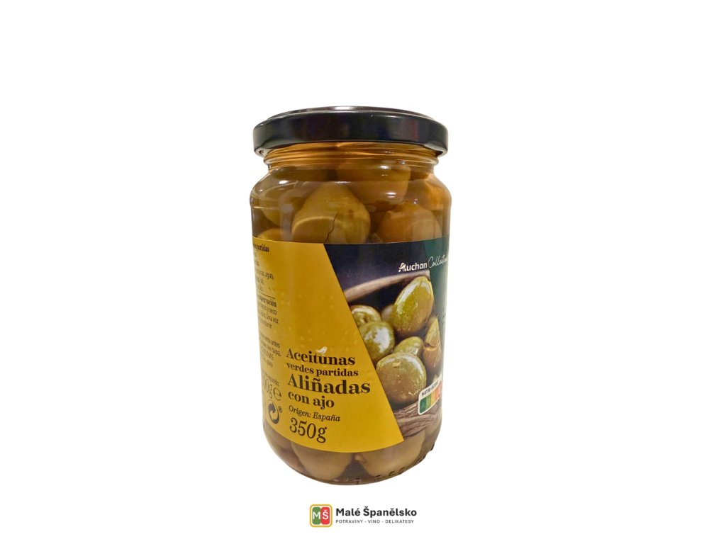 Zelené olivy „partidas“ s česnekem, Auchan Collection (Aloreña) – 350 g